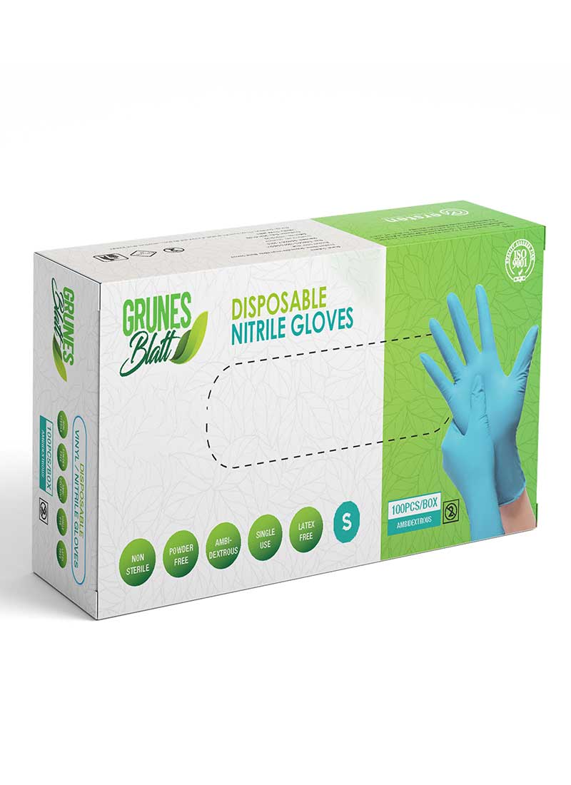 GRUNES BLATT BLUE NITRILE POWDER-FREE DISPOSABLE GLOVES ARE VERSATILE, LIGHTWEIGHT, AND PROVIDE RESILIENT PROTECTION. MADE FROM DURABLE NITRILE MATERIAL, THEY ARE IDEAL FOR USERS WITH LATEX ALLERGIES AND SUITABLE FOR MEDICAL, LABORATORY, AND FOOD INDUSTRY APPLICATIONS.